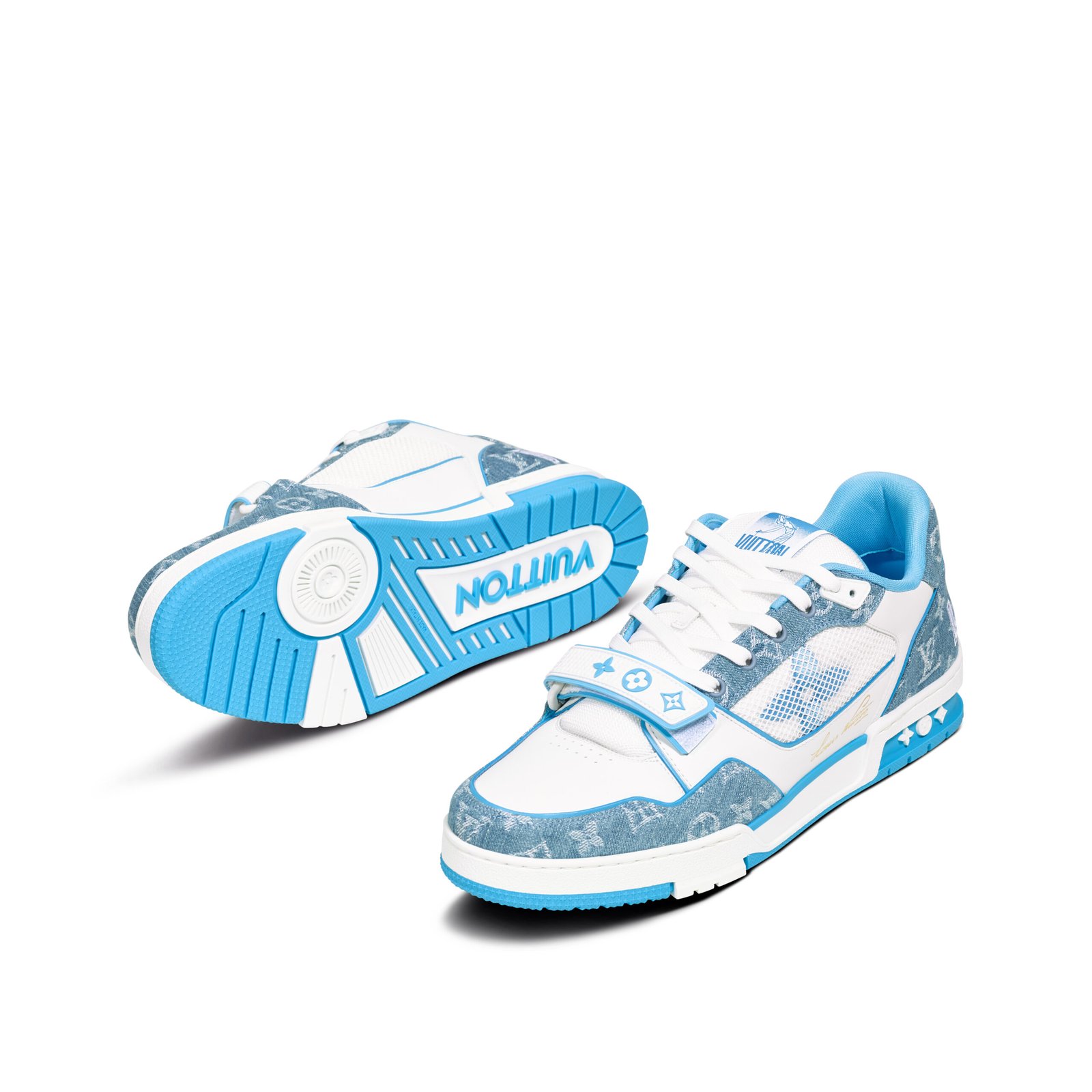 Louis Vuitton uses premium monogram denim across the upper to create texture and visual depth. Crisp white leather panels balance the look and add durability. Blue accents introduce a fresh contrast that enhances the sneaker’s contemporary appeal. Signature LV initials and monogram flower details reflect the brand’s iconic heritage.